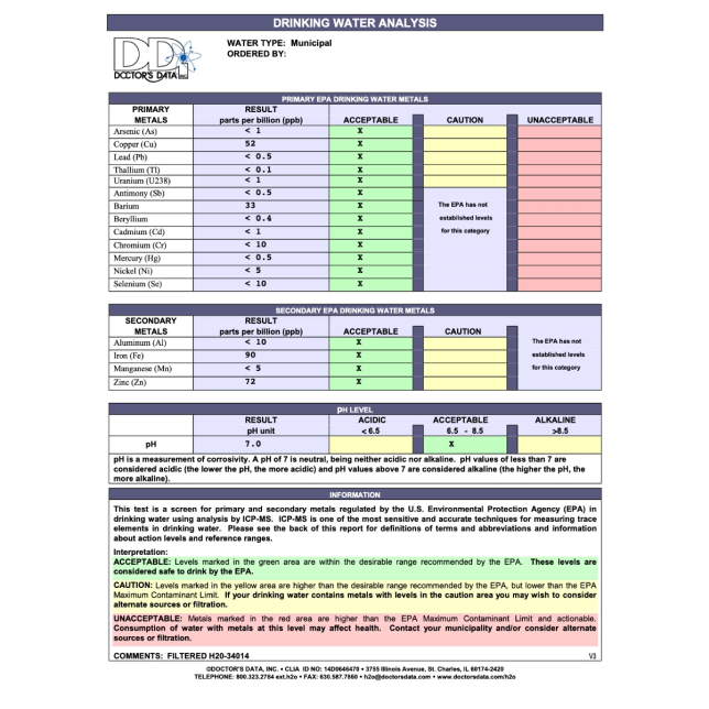 The Drinking Water Analysis Test detects trace elements in parts per billion (ppb). Determining unsafe levels of lead, arsenic or other heavy metals in your drinking water may benefit your health and wellbeing.