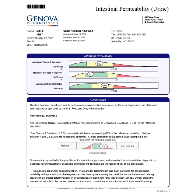 This test measures the clearance of two non-metabolized sugars (lactulose and mannitol) from the body and identifies malabsorption. Gastrointestinal malabsorption, or leaky gut, can reduce nutrient absorption, lower amino acid levels, negatively impact growth and be indicative of infection or inflammation. Those struggling with GI issues may find it useful to better understand the integrity of their gut absorption. Run with the Celiac & Gluten Sensitivity Test for a more comprehensive evaluation of gut permeability and inflammation.Â